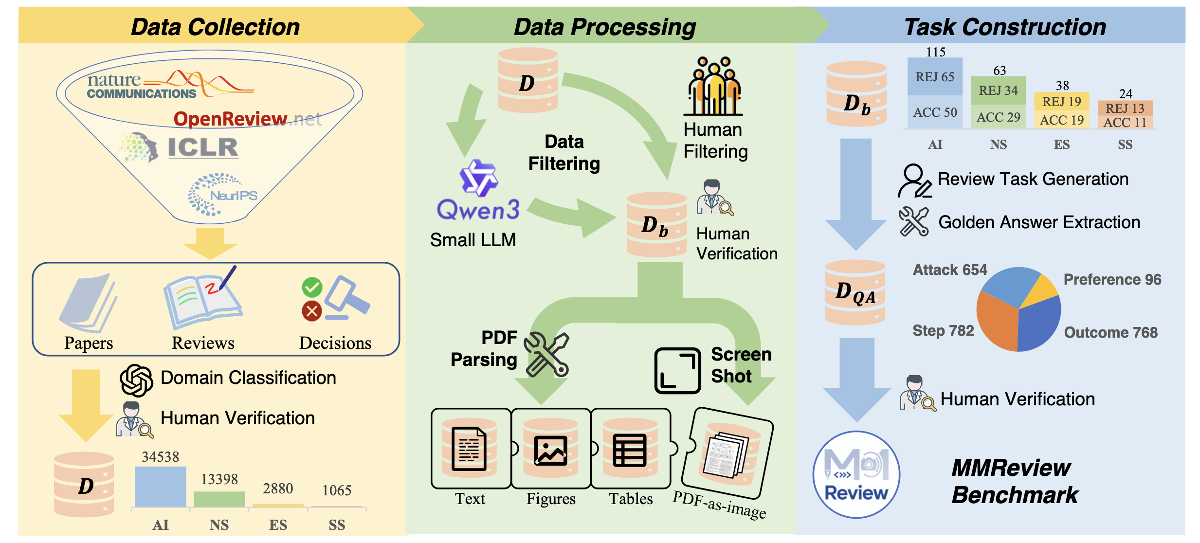 MM-Review, a multimodal academic peer-review benchmark that stresses structured reasoning and robustness.