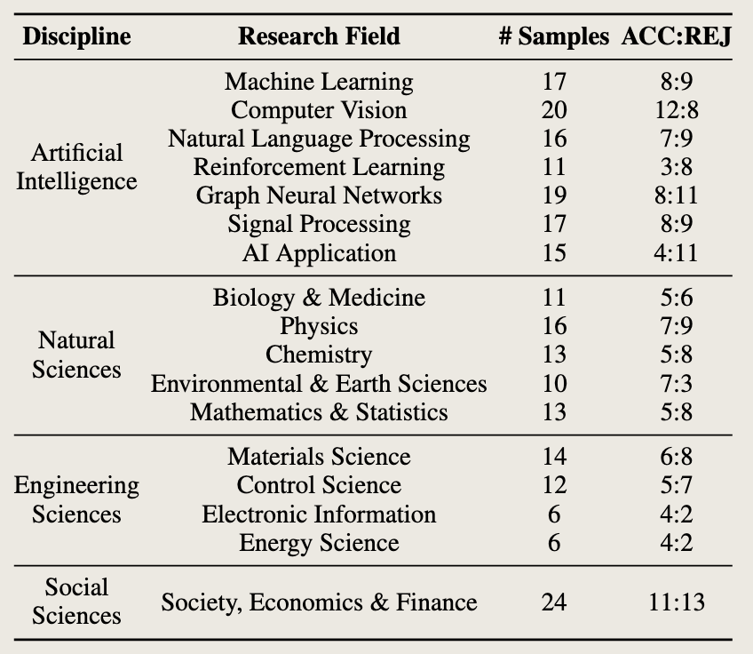 数据学科分布不均,48% 来自 AI 领域。“人类审稿”本身没有绝对标准。