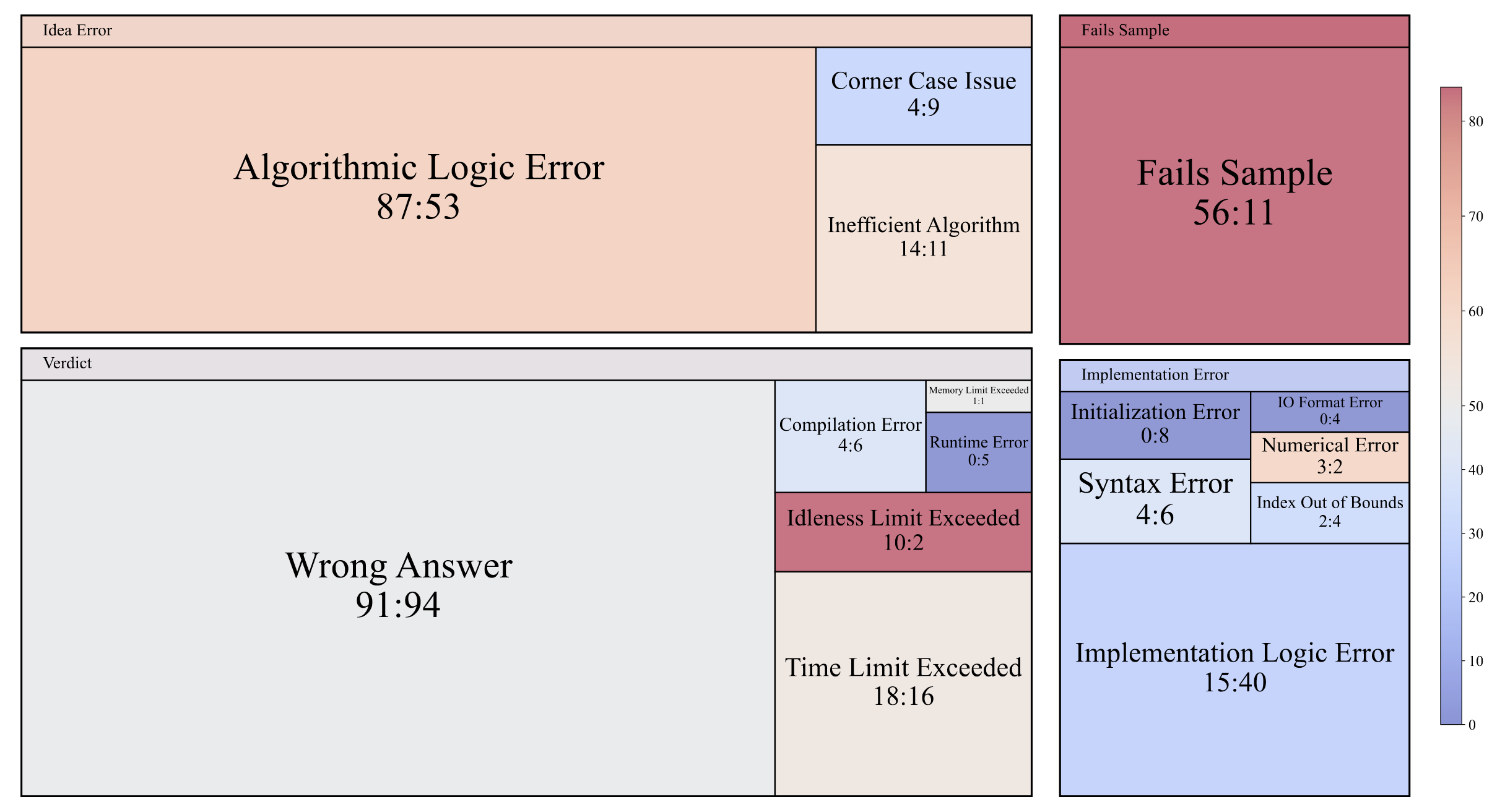 - 错误大多集中在算法本身,如图。(与近似分数的人类做对比)而且样例没过的有很多,因为是Pass@1.´